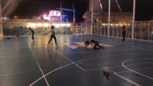 Septembre 2019 : départ de Barcelone direction Palma, puis Marseille, la Toscane (visite obligée de Florence), Rome, Naples et retour à Barcelone, le tout sur un rythme effréné, avec 6 500 passager.ère.s et 2 300 employé.e.s à bord. Les artistes se donnent pour mission d’explorer le bateau en une semaine, son architecture mais aussi ses usages et fonctions : la soirée blanche ou la soirée du capitaine « pour madame » avec « les jolies hôtesses pour monsieur », la trentaine de bars et de restaurants, les discothèques, boutiques en tous genres, spa, planétarium, salles de jeux et de sport, murs d’escalade, piscines et même piste de footing qui emprunte les innombrables couloirs. L’équipage est hyper professionnel. L’information est partout. Soit par les messages régulièrement diffusés dans les coursives. Soit à travers une application qui énumère les activités du jour : la météo, l’organisation d’ateliers (pliage de serviettes), le calendrier des soirées et le dress code, et surtout les mesures d’hygiène, avec une vraie hantise des virus gastriques (le Covid n’avait pas encore fait son apparition). Tout est sous contrôle. Même si les déplacements sont toujours fluides (jamais de longues files d’attente), l’expérience est éprouvante tant le bâtiment est immense. C’est l’empire de la démesure !